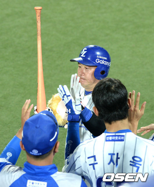 14일 오후 대구야구장에서 열린 '2015 타이어뱅크 KBO 리그' 삼성 라이온즈와 한화 이글스의 경기, 6회말 무사에서 삼성 진갑용이 솔로포를 날리고 동료선수들과 하이파이브를 하고 있다.