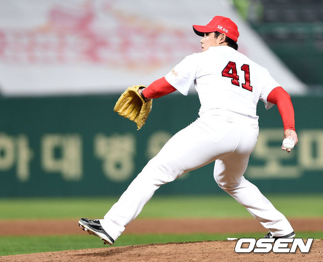 8회초 1사에서 SK 문광은이 힘차게 공을 던지고 있다.