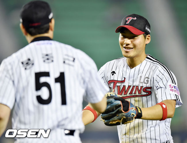 14일 오후 서울 잠실야구장에서 열린 '2015 타이어뱅크 KBO 리그' LG 트윈스와 NC 다이노스의 경기, 연장 10회초 2사 NC 나성범의 2루수 라인드라이브 타구를 몸을 날려 잡아낸 LG 2루수 박지규가 봉중근과 하이파이브를 하고 있다.