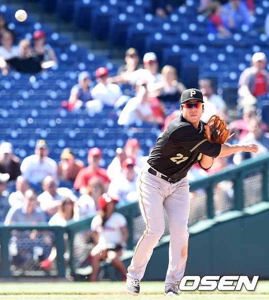 8회말 필라델피아 공격 1사 2루 상황, 피츠버그 3루수 강정호가 제프 프랑코어의 땅볼 타구를 잡아 1루로 송구하고 있다. 이 장면은 처음 세이프로 판정 됐지만 피츠버그 측의 챌린지 요청 끝에 아웃으로 번복 판정됐다./dreamer@osen.co.kr