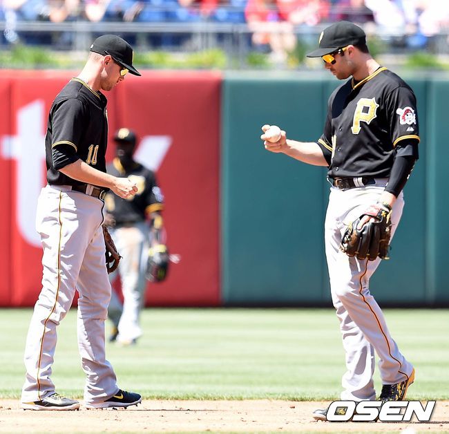 3회말 필라델피아 공격 2사 1, 3루 상황 피츠버그 유격수 조디 머서(왼쪽)가 사이즈모어의 땅볼 타구를 놓치는 실책을 범한 뒤 2루수 닐 워커와 함께 아쉬워하고 있다./dreamer@osen.co.kr