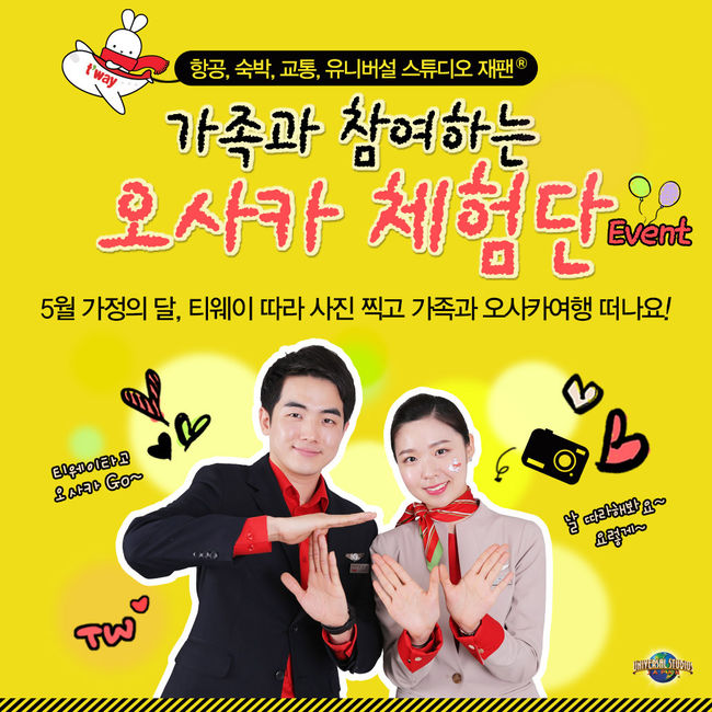 티웨이항공 관계자는 “가정의 달을 맞이하여 고객이 가족 간 추억을 남길 수 있도록 이벤트를 준비했다. 이벤트 참여를 통해 가족과 추억의 사진을 남기고 덤으로 오사카여행의 기회도 얻을 수 있다. 누구나 참여할 수 있는 티웨이항공의 오사카 체험단에 도전해보시길 바란다”고 밝혔다.