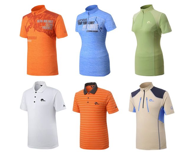 왼쪽 상단부터 아이스 콜드 마쏘니코 집업티셔츠 남성용, 마쏘니코 집업티셔츠 여성용, 탄트라 집업티셔츠, 엘로라 폴로 셔츠, 인티모 스트라이프 폴로 셔츠, 팔라디오 집업티셔츠. /네파 제공.