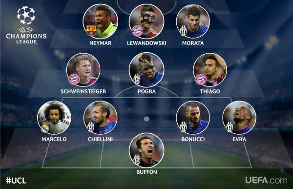 유벤투스는 친정팀 레알 마드리드에 비수를 꽂은 알바로 모라타와 골문을 사수한 잔루이지 부폰을 비롯해 빗장 수비(카테나치오)로 레알의 막강화력을 막아낸 지오르지오 키엘리니, 레오나르도 보누치, 파트리스 에브라, 부상에서 복귀해 모라타의 동점골을 도왔던 폴 포그바 등이 이름을 올렸다. 유벤투스는 UCL 4강전서 스페인 명문 레알 마드리드를 만나 합계 3-2로 따돌리고 지난 2003년 이후 12년 만에 꿈의 무대 결승에 진출했다.