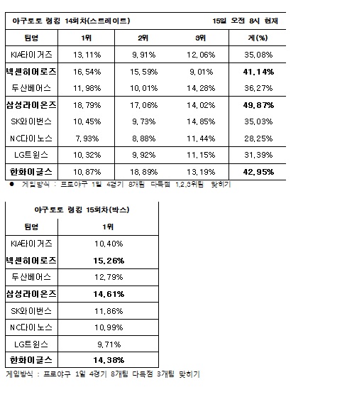 한편, 순위에 상관없이 다득점 3개팀만을 맞히는 ‘박스’ 게임에서는 넥센(15.26%)이 1순위를 차지한 가운데, 삼성(14.61%)과 한화(14.38%)가 뒤를 이었다.