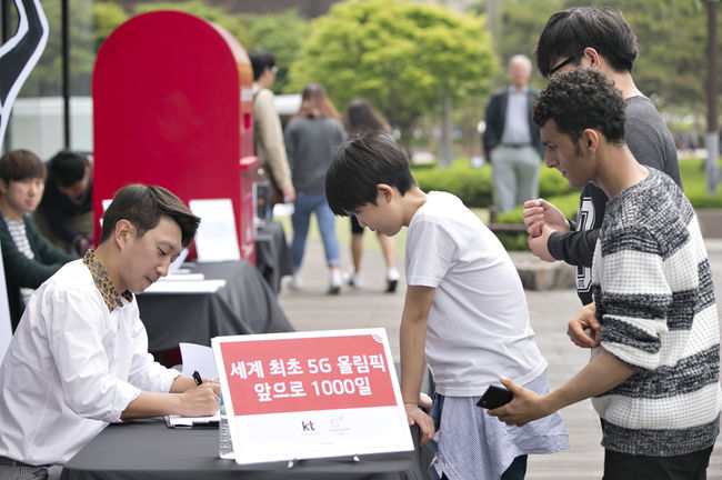 KT는 16일 세계 최초의 5G 올림픽이 될 2018평창동계올림픽 G-1000을 맞아 대내·외로 다양한 마케팅 활동을 전개한다고 밝혔다. 사진은 2018년 평창동계올림픽 및 장애인 동계올림픽 홍보대사인 이규혁이 KT 광화문 올레스퀘어 이벤트 공간에서 시민들에게 사인을 해주고 있는 모습. / KT 제공