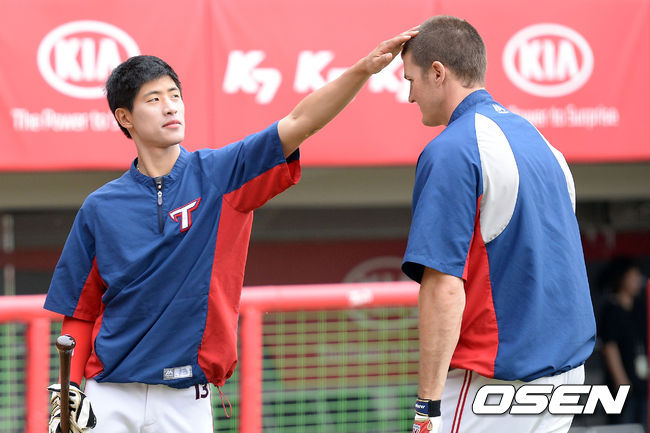 경기전 KIA 강한울이 필의 머리를 만지고 있다.