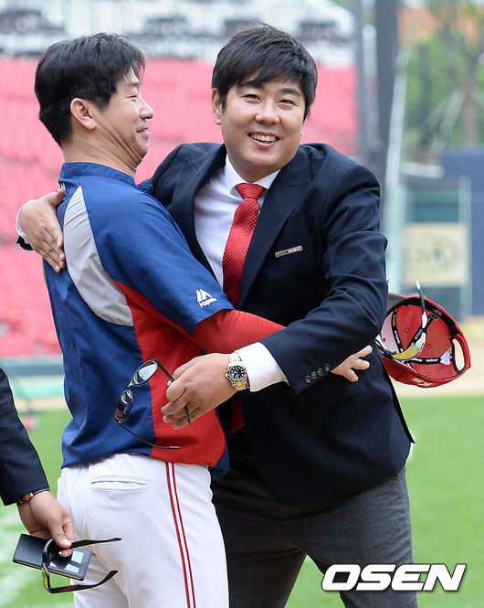 경기전 KIA 김종국코치와 정민철 해설위원이 포옹을 하고 있다.