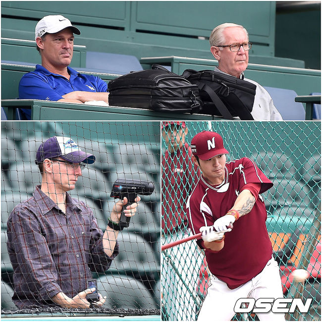 경기에 앞서 넥센 박병호가 미국 메이저리그 스카우터가 지켜보는 가운데 타격 훈련을 하고 있다.