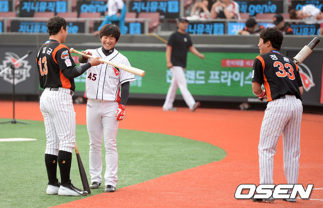 경기에 앞서 kt 하준호와 롯데 황재균이 이야기를 나누고 있다.
