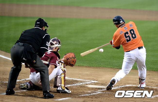 1회말 2사 1루에서 한화 이종환이 좌중간 안타를 날리고 있다.