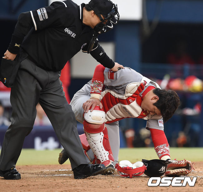 15일 오후 서울 잠실구장에서 열린 '2015 타이어뱅크 KBO 리그' LG 트윈스와 SK 와이번스의 경기 3회말 1사 유강남의 파울타구에 맞은 정상호가 고통을 호소하고 있다.
