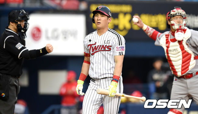 15일 오후 서울 잠실구장에서 열린 '2015 타이어뱅크 KBO 리그' LG 트윈스와 SK 와이번스의 경기 3회말 2사 오지환이 포수 스트라이크 낫아웃으로 물러나고 있다.
