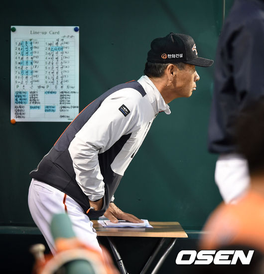 3회초 한화 김성근 감독이 자리에서 일어나 경기를 지켜보고 있다.