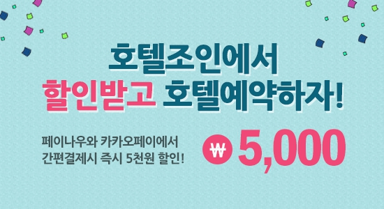 국내∙해외 호텔&리조트 할인예약 전문 호텔조인(www.hoteljoin.com)에서는 모바일 간편결제 서비스 ‘페이나우(Paynow)’에 이어 ‘카카오페이(Kakaopay)’를 오픈했으며, 각각의 간편결제 서비스를 첫 이용하는 이에게 즉시 5000원의 할인혜택을 제공하는 이벤트를 진행 중이라고 밝혔다.