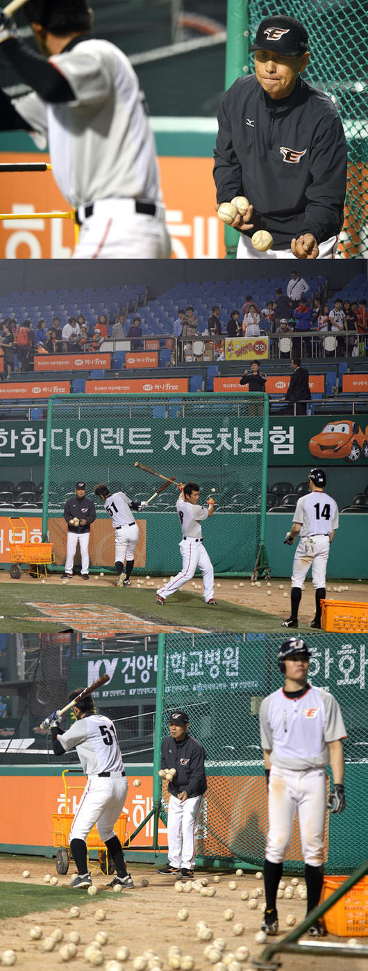 경기에서 패한 김 감독은 가만히 있지 않았다. 경기 종료 시간은 밤 9시38분. 그로부터 20분도 되지 않은 9시55분 김성근 감독이 그라운드에 등장했다. 아직 경기장을 빠져나가지 않은 관중들이 김 감독의 이름을 연호했다. 그라운드에는 배팅훈련을 위한 장비들이 세팅되기 시작했다. 역시 '특타'였다.
