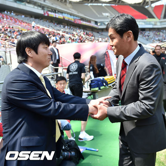 경기 전 전북 노상래 감독과 서울 최용수 감독이 악수를 나누고 있다.