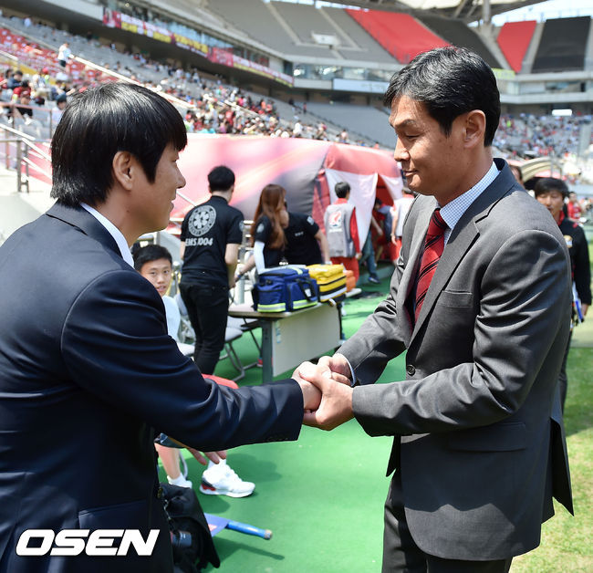 경기 전 전북 노상래 감독과 서울 최용수 감독이 악수를 나누고 있다.