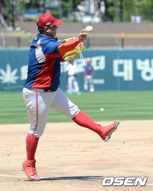 경기전 KIA 나지완이 내야 펑고를 받고 있다.