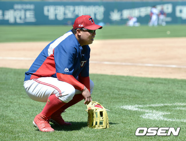 경기전 KIA 나지완이 내야 수비 훈련을 마친 뒤 숨을 고르고 있다.
