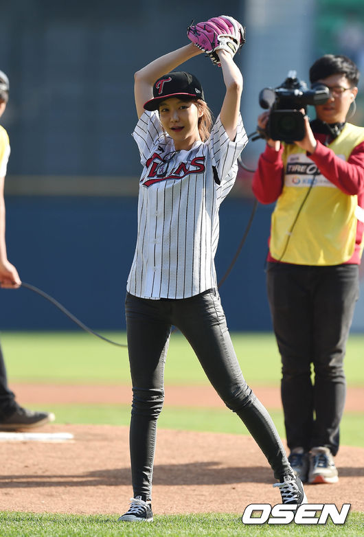 16일 오후 서울 잠실구장에서 열린 '2015 타이어뱅크 KBO 리그' LG 트윈스와 SK 와이번스의 경기 시작전 신소율이 시구를 하고 있다.