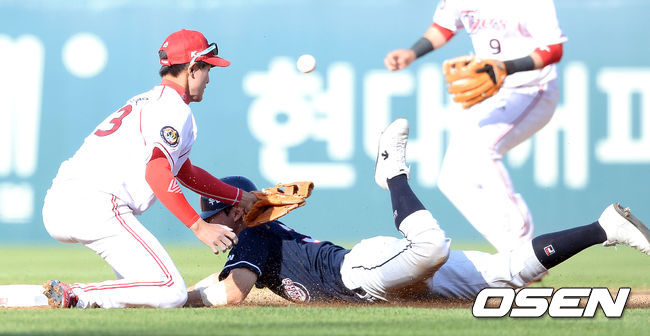 1회초 1사 1루 두산 정수빈이 2루 도루를 성공하고 있다.