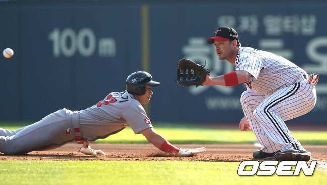 16일 오후 서울 잠실구장에서 열린 '2015 타이어뱅크 KBO 리그' LG 트윈스와 SK 와이번스의 경기 1루수로 출전한 한나한이 루카스의 견제구를 받고 있다.