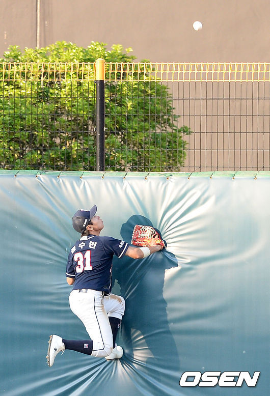 4회말 2사 1루 두산 정수빈이 KIA 이범호의 홈런 타구를 바라보고 있다.