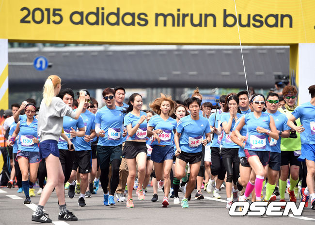 17일 부산 해운대구 중동 BEXCO 야외 주차장에서 진행된 '2015 아디다스 마이런 부산' 에프엑스 빅토리아와 루나가 질주하고 있다.