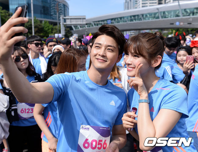 17일 부산 해운대구 중동 BEXCO 야외 주차장에서 진행된 '2015 아디다스 마이런 부산'에서 배우 김지훈과 방송인 정가은이 셀카를 찍고 있다.