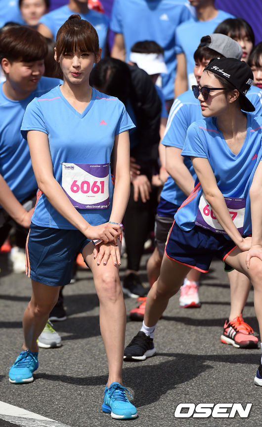 17일 부산 해운대구 중동 BEXCO 야외 주차장에서 진행된 '2015 아디다스 마이런 부산'에서 정가은과 손수현이 스트레칭을 하고 있다.