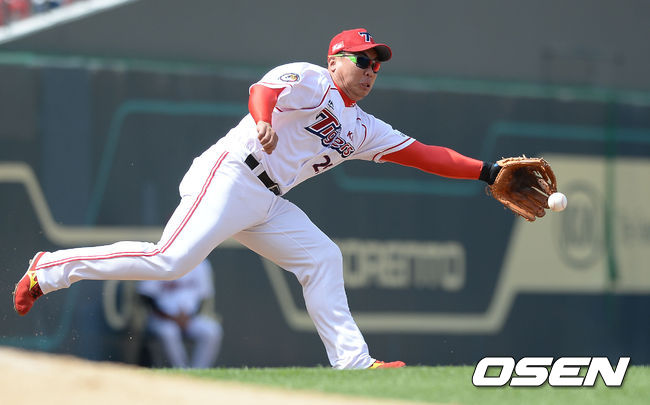 3회초 2사 KIA 이범호가 두산 허경민의 타구를 잡으려하고 있다.
