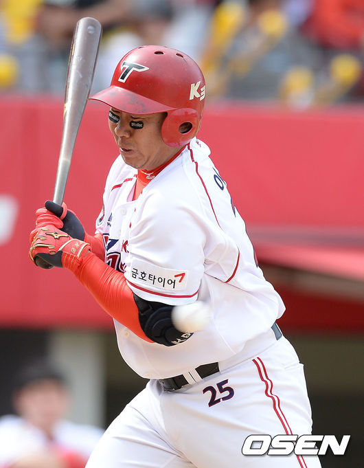 4회말 1사 KIA 이범호가 두산 장원준의 몸쪽에게 맞아 고통스러워하고 있다.
