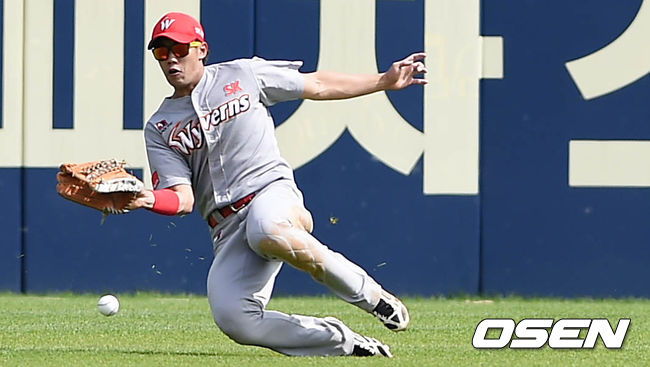 17일 오후 서울 잠실야구장에서 열린 '2015 타이어뱅크 KBO 리그' LG 트윈스와 SK 와이번스의 경기, 5회말 1사 주자 없는 상황 SK 이명기가 LG 최경철의 타구 처리과정에서 공이 빠지고 있다.