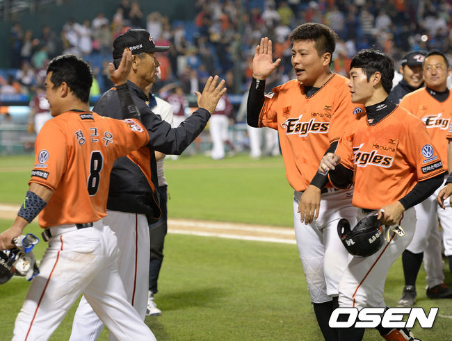 김성근 감독은 "5회까지만 팽팽하게 가면 재미있는 승부가 될 것이다. 초반에 점수를 뺏기지 않는 게 중요하다"고 했다. 하지만 3회초까지 0-6, 일방적인 스코어로 뒤지며 힘겨운 경기가 됐다. 그런데 3회말 2점을 시작으로 4회 1점, 7회와 8회도 1점씩 야금야금 따라붙더니 9회말 김경언의 동점 솔로포, 10회말 강경학의 밀어내기 볼넷으로 끝내기 역전승을 완성했다.