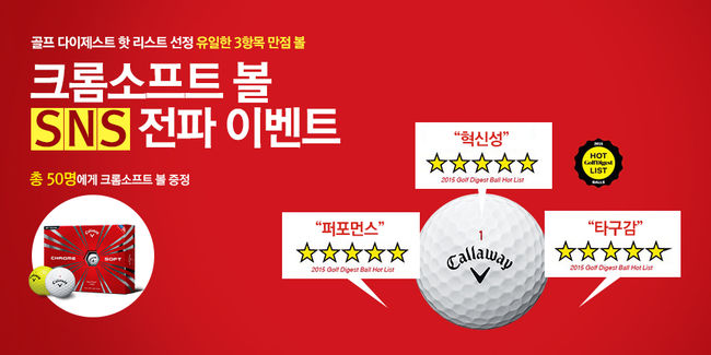 캘러웨이골프의 크롬소프트 볼이 2015 미국 골프다이제스트가 선정한 골프용품의 볼 핫 리스트(Hot List)에서 유일하게 3개 항목(퍼포먼스, 타구감, 혁신성) 모두 만점을 받았다. 이를 기념하기 위해 크롬소프트 볼 SNS 전파 이벤트가 시작된다.