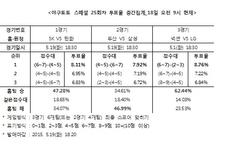 국민체육진흥공단(www.kspo.or.kr)이 발행하는 체육진흥투표권 공식 온라인 발매 사이트 베트맨(www.betman.co.kr)이 19일(화)에 열리는 2015시즌 한국프로야구(KBO) 3경기를 대상으로 한 야구토토 스페셜 25회차 투표율을 중간 집계한 결과, 참가자의 47.28%는 SK-한화(1경기)전에서 SK가 한화에 승리할 것이라 예상했다.