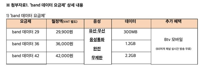 ‘band 데이터 요금제’는 통신3사 중 최초로 2만원대 최저 요금제부터 100요금제까지 총 8종의 모든 요금 구간에서 유선과 무선 통화를 무제한 제공한다.