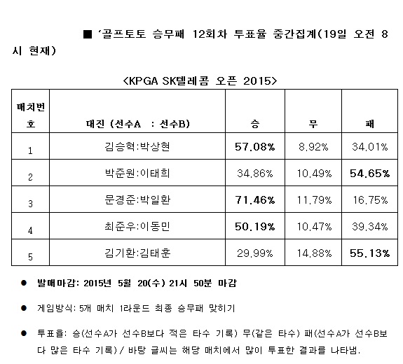 국민체육진흥공단(www.kspo.or.kr)이 발행하는 체육진흥투표권 수탁사업자인 스포츠토토 공식 온라인 발매 사이트인 베트맨(www.betman.co.kr)은 오는 21일에 스카이72에서 열리는 'KPGA SK텔레콤 오픈 2015' 1라운드를 대상으로 한 골프토토 승무패 12회차 1번 매치에서 A선수인 김승혁(57.08%)이 B선수인 박상현(34.01%)보다 좋은 성적을 기록할 것으로 예상했다고 밝혔다.
