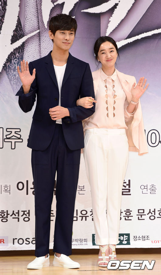 배우 주지훈과 수애가 포토타임을 갖고 있다.