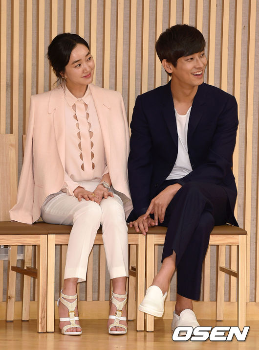 배우 수애와 주지훈이 포토타임을 기다리며 미소를 짓고 있다.