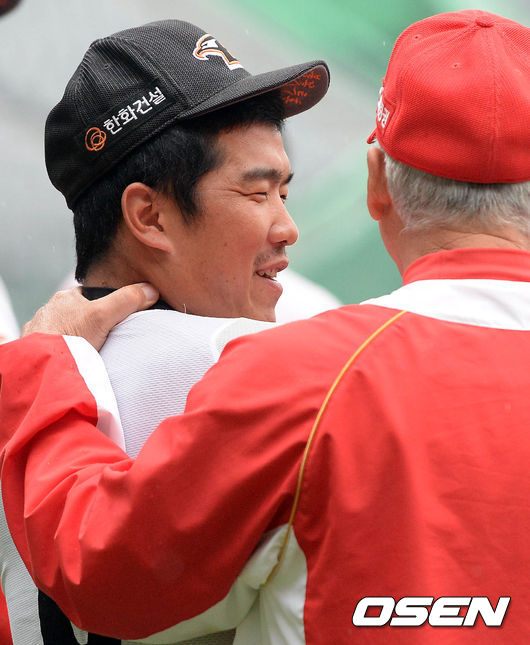 19일 오후 인천SK행복드림구장에서 열리는 '2015 타이어뱅크 KBO 리그' SK 와이번스와 한화 이글스의 경기 시작전 정근우가 알바레즈 코치와 이야기를 나누고 있다.