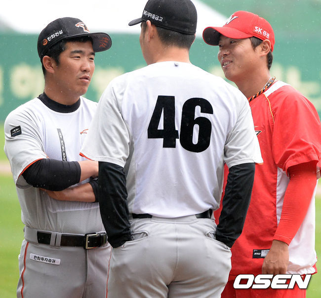 19일 오후 인천SK행복드림구장에서 열리는 '2015 타이어뱅크 KBO 리그' SK 와이번스와 한화 이글스의 경기 시작전 정근우, 박재상, 송은범이 이야기를 나누고 있다.