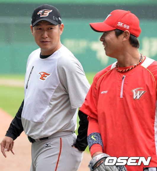 19일 오후 인천SK행복드림구장에서 열리는 '2015 타이어뱅크 KBO 리그' SK 와이번스와 한화 이글스의 경기 시작전 송은범과 박재상이 이야기를 나누고 있다.