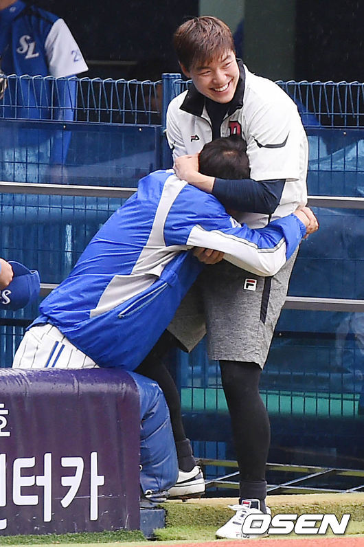 19일 오후 서울 잠실야구장에서 열린 '2015 타이어뱅크 KBO 리그' 두산 베어스와 삼성 라이온즈의 경기, 경기시작전 두산 민병헌과 삼성 채태인이 포옹을 나누고 있다.