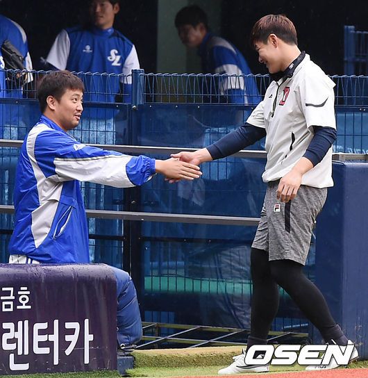 19일 오후 서울 잠실야구장에서 열린 '2015 타이어뱅크 KBO 리그' 두산 베어스와 삼성 라이온즈의 경기, 경기시작전 삼성 채태인과 두산 민병헌이 인사를 나누고 있다.