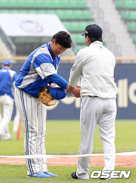 19일 오후 서울 잠실야구장에서 열린 '2015 타이어뱅크 KBO 리그' 두산 베어스와 삼성 라이온즈의 경기, 경기시작전 삼성 이승엽이 두산 코치와 인사를 나누고 있다.