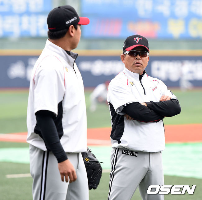 19일 오후 서울 목동구장에서 열리는 '2015 타이어뱅크 KBO리그' 넥센 히어로즈와 LG 트윈스의 경기에 앞서 LG 양상문 감독이 류제국과 이야기를 나누고 있다.