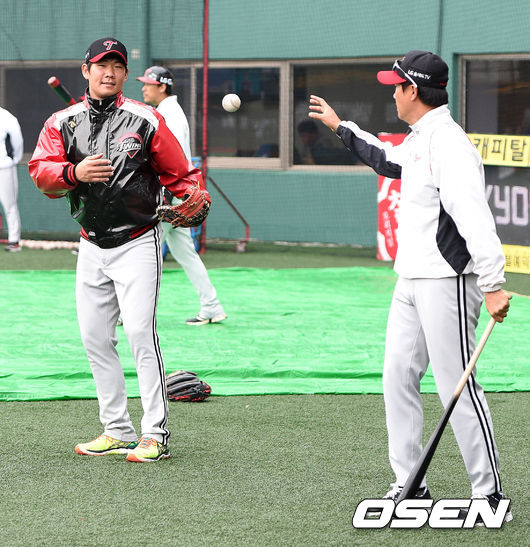 19일 오후 서울 목동구장에서 열리는 '2015 타이어뱅크 KBO리그' 넥센 히어로즈와 LG 트윈스의 경기에 앞서 LG 정찬헌이 투수 훈련을 돕고 있다.