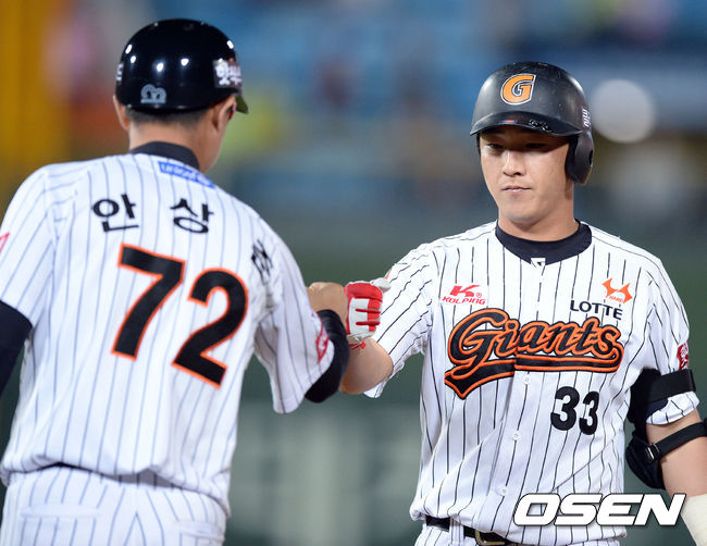 19일 부산 사직구장에서 열린 '2015 타이어뱅크 KBO 리그' 롯데 자이언츠와 KIA 타이거즈의 경기, 7회말 2사 1,2루 롯데 정훈이 1타점 적시타를 날린뒤 안상준 1루 코치와 하이파이브를 하고 있다.